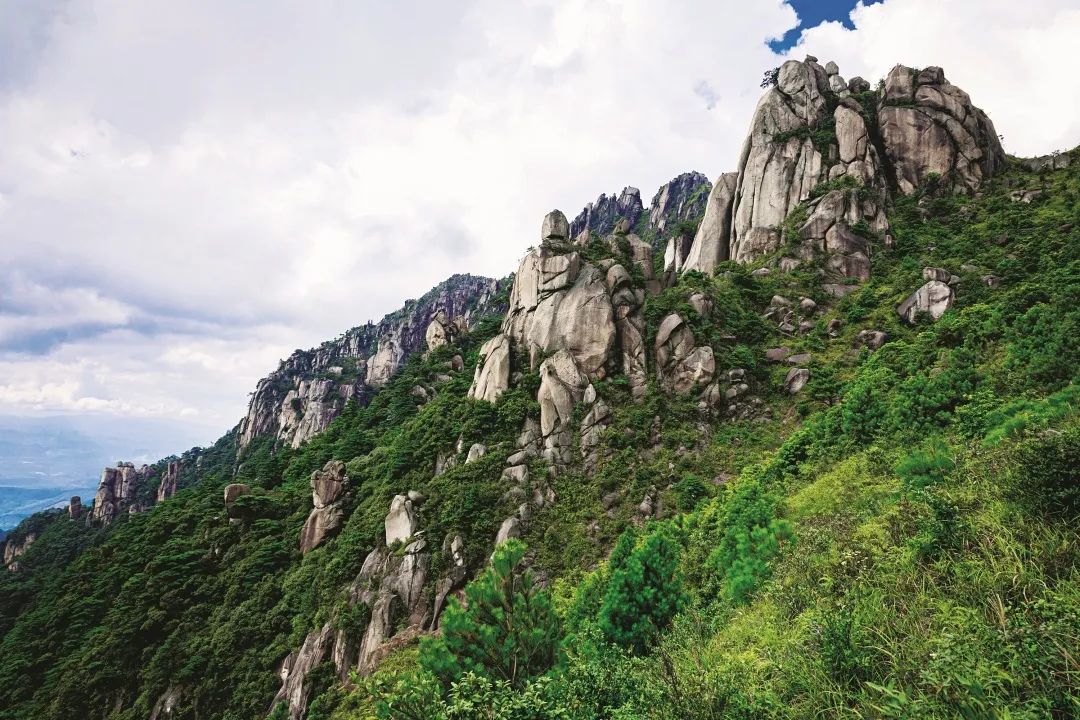 花岗岩是深成岩浆岩,它是由地下深处炽热的岩浆上升失热冷凝而成。这些花岗岩在数千万至上亿年前侵入到地表以下 3 公里深。南岭处于造山带中,经过多次地壳抬升,上覆厚厚的岩层被侵蚀殆尽,现出露地表形成高耸的山岳。南方湿润多雨的气候使花岗岩风化剥蚀,深厚的花岗岩风化壳是南岭肥沃土壤的成土母质,植被覆盖率极高,整个花岗岩山峰连绵起伏,层峦叠嶂,郁郁葱葱。