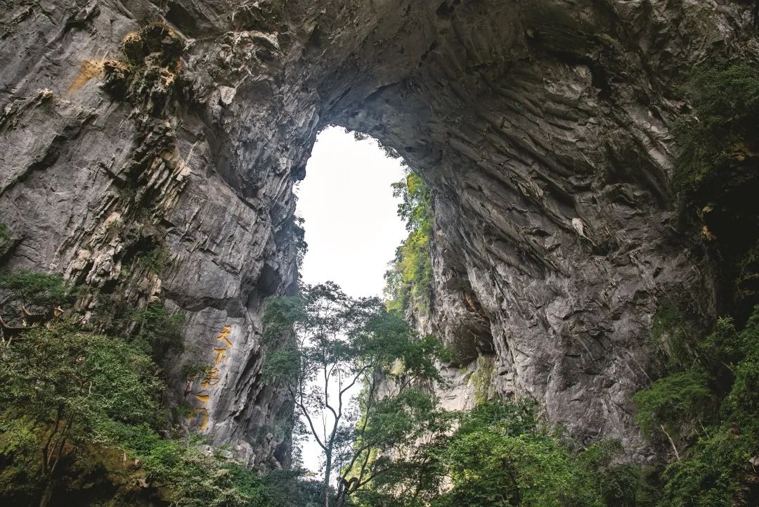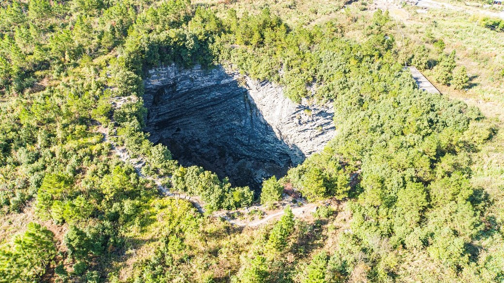 在公园东北部的岩溶高原上发育了极为罕见的天坑—乳源通天箩,形态酷似一个倒伏的米箩,故名“通天箩”。它是完全封闭的下降洞,垂直深度约 97 米,井口直径约 70 米,