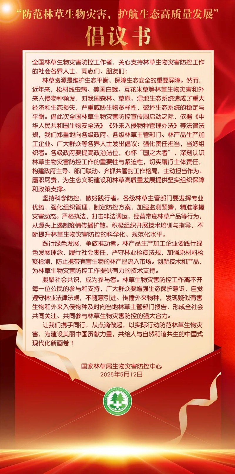 当前,外来物种入侵、病虫害扩散等生物灾害风险日益严峻,直接威胁森林草原安全与生态安全。为推动全社会协同筑牢林草生物安全防线,凝聚“防灾护绿、共护生态”的强大合力,值此第17个全国防灾减灾日到来之际,我们特向全国各级林草主管部门和广大群众发出倡议: