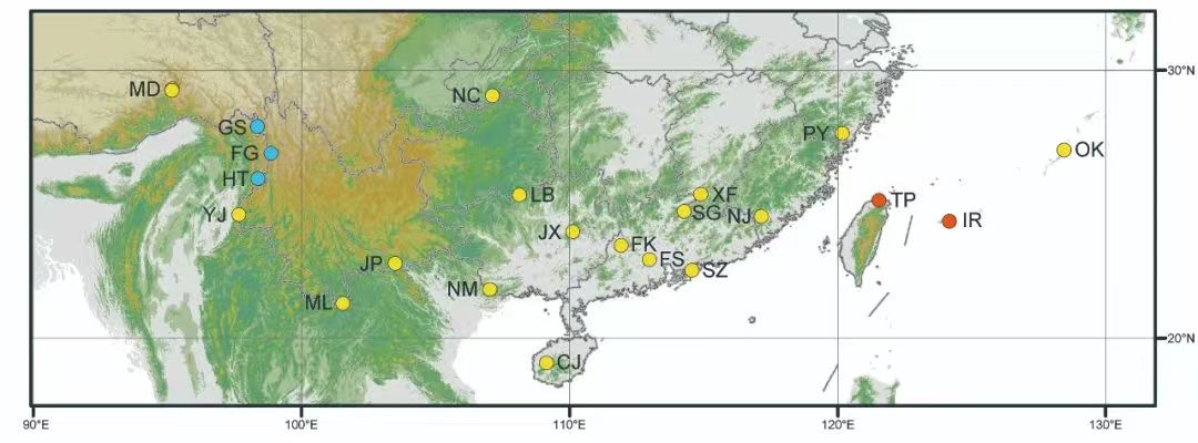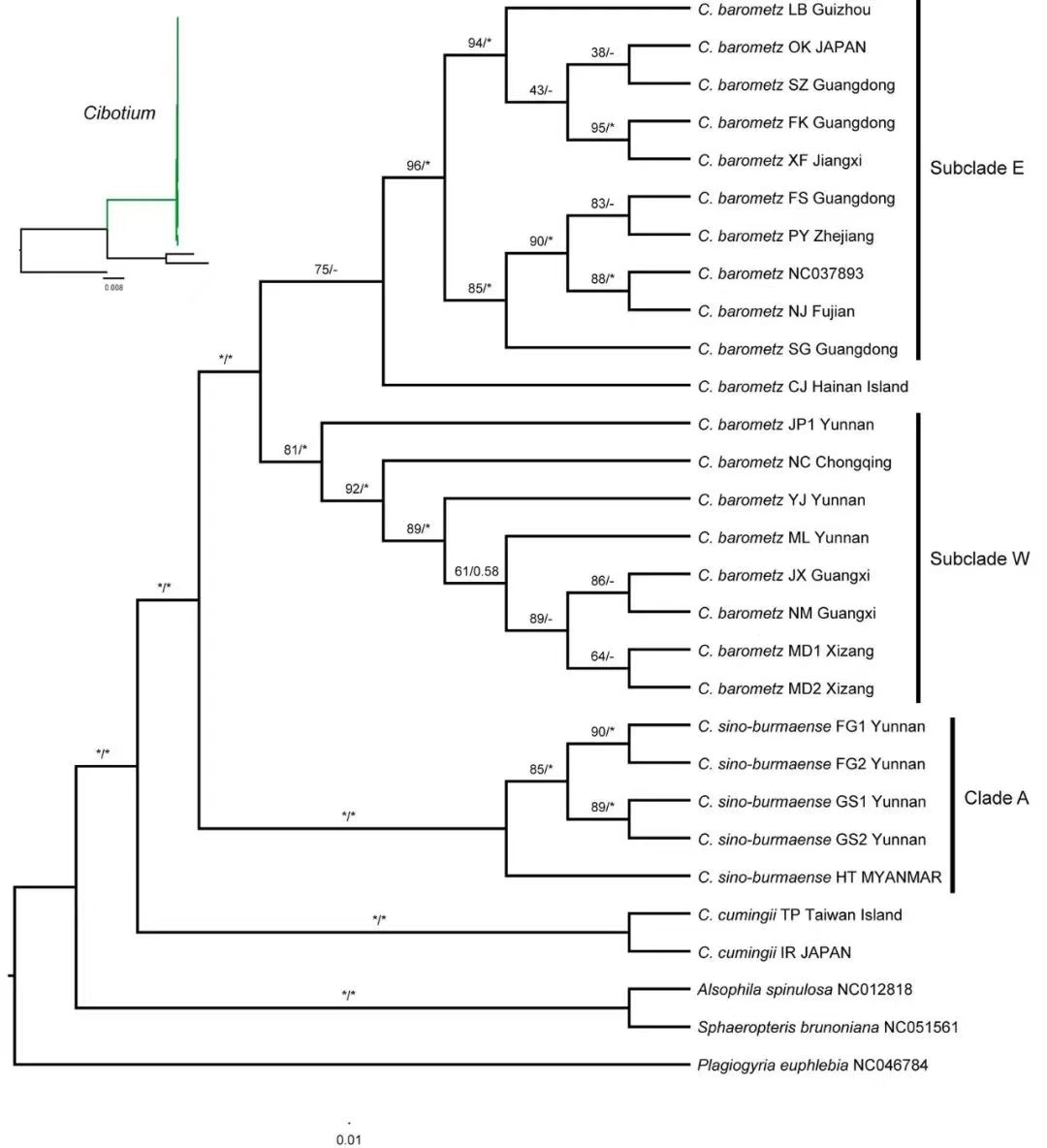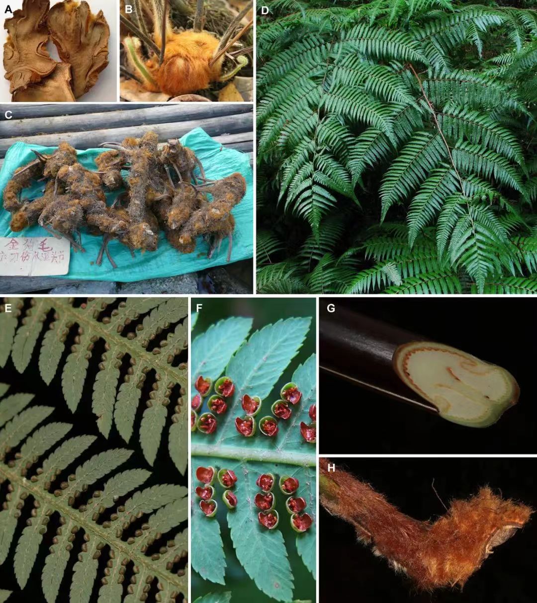 金毛狗科Cibotiaceae仅有一属,约10个物种,主要分布在中部美洲、夏威夷群岛及亚洲的热带和亚热带地区。我国已知2种,其中,金毛狗Cibotium barometz (L.) J.Sm.的分布较为广泛,常见于亚洲的亚热带和热带地区,以我国华南地区为分布中心。金毛狗是传统药材“狗脊”的基原植物,且由于姿态优美、四季常绿、根状茎形似一只仰卧的金毛小狗,常被作为观赏植物和工艺品销售。无序的采挖和生境的破坏已造成野外资源量急剧减少。该物种早已被列入濒危野生动植物种国际贸易公约附录2 (CITES, Appendix II),是唯一产自亚洲的药用蕨类植物。目前,金毛狗属Cibotium全属被纳入《国家重点保护野生植物名录》二级保护范畴。