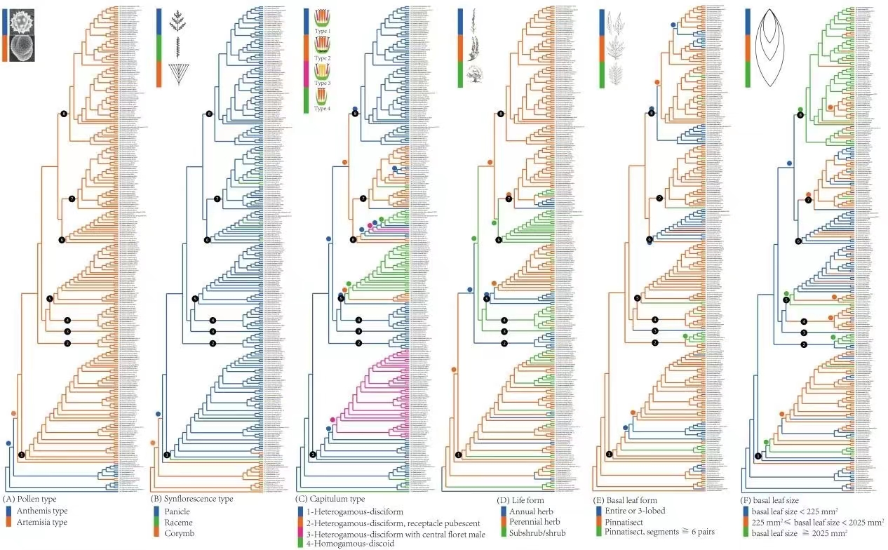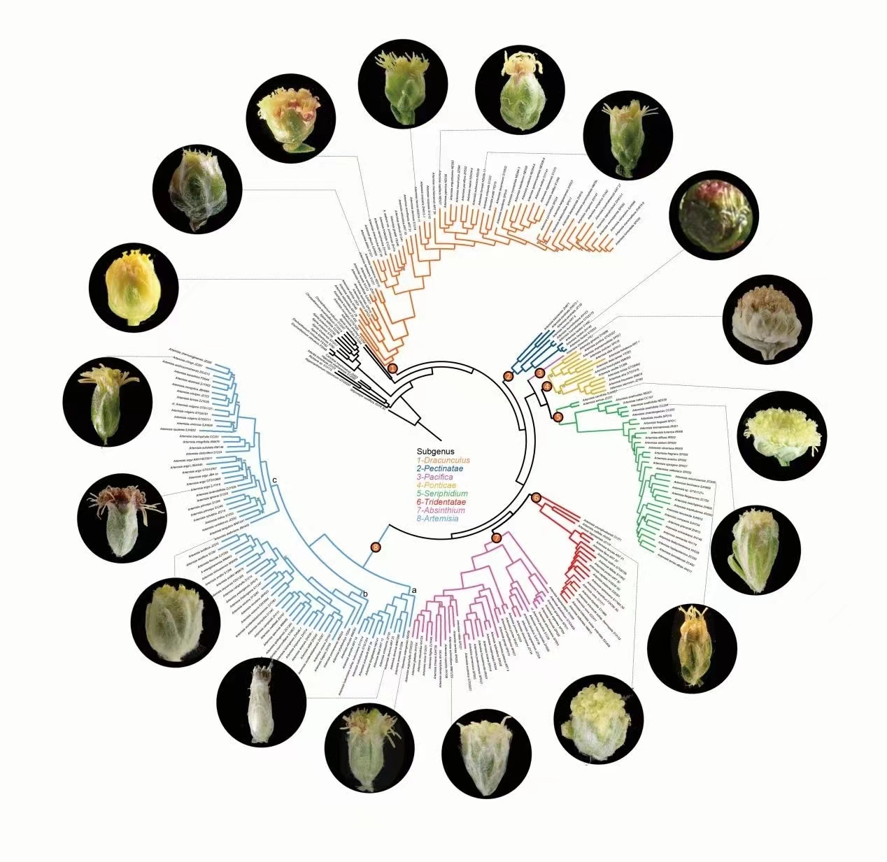 研究进一步分析了6个关键分类性状的演化式样。结果表明,花粉类型和头状花序类型一起很好地界定了蒿属的范围;头状花序类型是蒿属亚属分类的重要特征,而生活型、叶形和叶片大小可辅助亚属划分。依据上述结果,该研究将喀什菊属并入蒿属,并提出新的蒿属属下分类方案,共包括8个亚属,其中新亚属2个,调整原亚属范围5个,保留原亚属范围1个。这一成果革新了已使用近200年的传统分类方案,为完成世界蒿属植物分类学专著、深入开发全球蒿属植物资源奠定了重要基础。