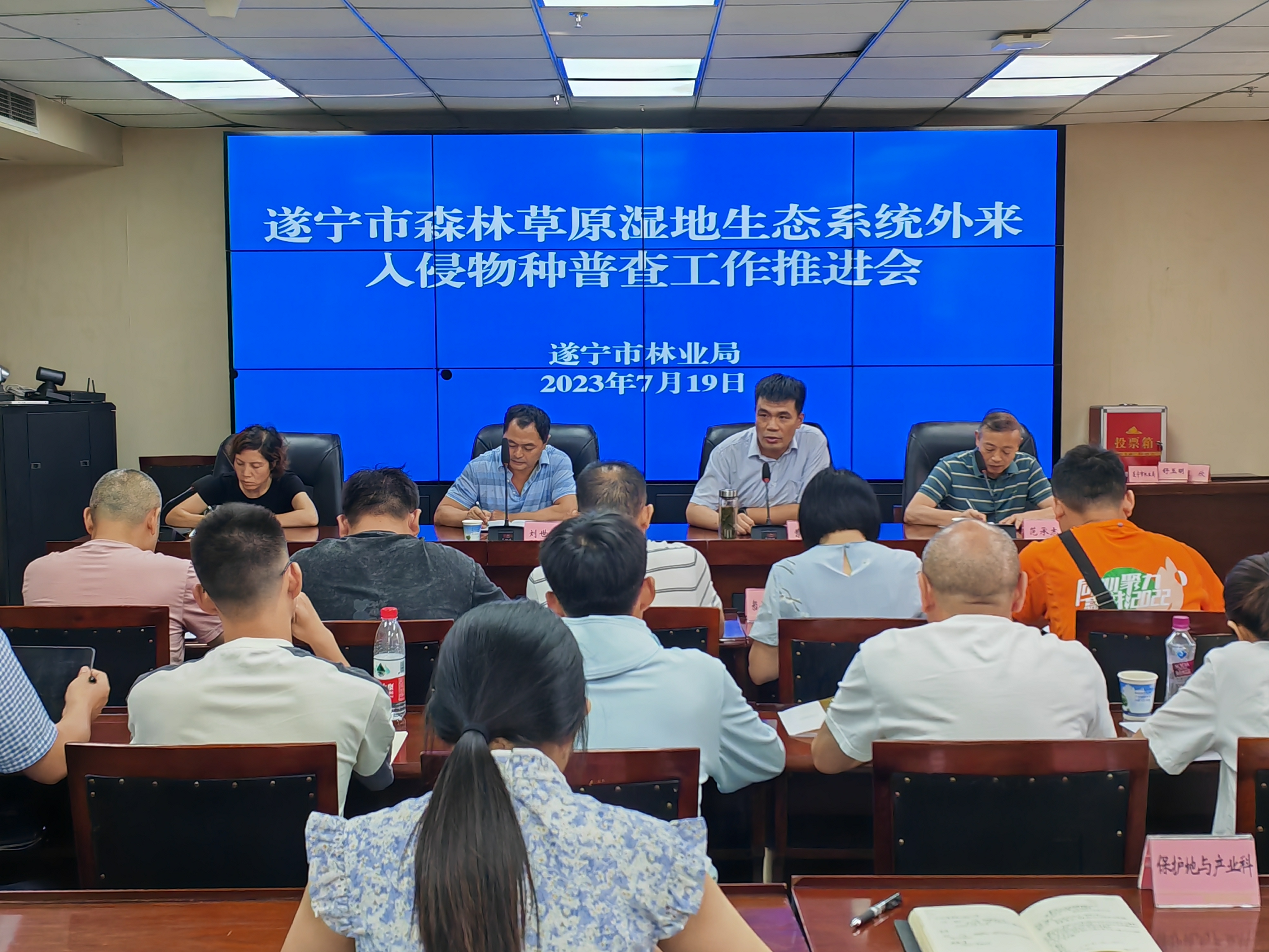 2023年7月19日,省林草局检查组莅临遂宁检查指导森林草原湿地生态系统外来入侵物种普查工作,并召开了工作推进会。市林业局副局长曹健、保护地与产业科、森防站相关同志,各县(市、区)林业局分管领导、股室负责人、实施单位30余人参加会议。