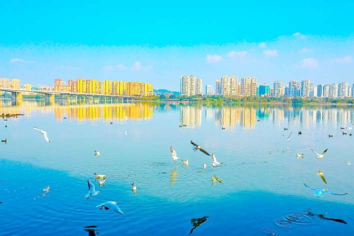 随着生态湿地公园建设和环境提升,越来越多的红嘴鸥到遂宁栖息。 李四海摄