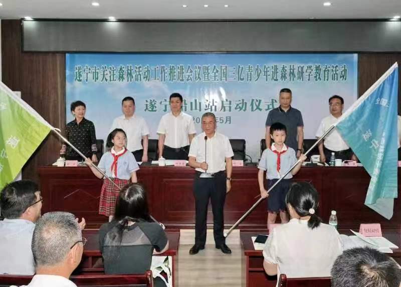 5月28日,遂宁市关注森林活动工作推进会议暨全国三亿青少年进森林研学教育活动遂宁船山站启动仪式举行。市政协副主席、民建遂宁市委主委、遂宁市关注森林活动组委会主任邓云宣布船山站启动并为船山站队伍授旗。