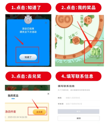 1.领奖时间:2023年4月18日开始至4月28日结束,仅限工作日9:00-17:30。逾期未领取或未在兑奖开始时间2023年4月27号前填写兑奖信息,视为自动放弃奖品。