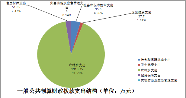 2024年度一般公共预算财政拨款支出2096.30万元,主要用于以下方面:社会保障和就业支出95.60万元,占4.56%;卫生健康支出27.70万元,占1.32%;农林水支出1918.35万元,占91.51%;住房保障支出51.65万元,占2.47%;灾害防治及应急管理支出3.00万元,占总支出的0.14%。