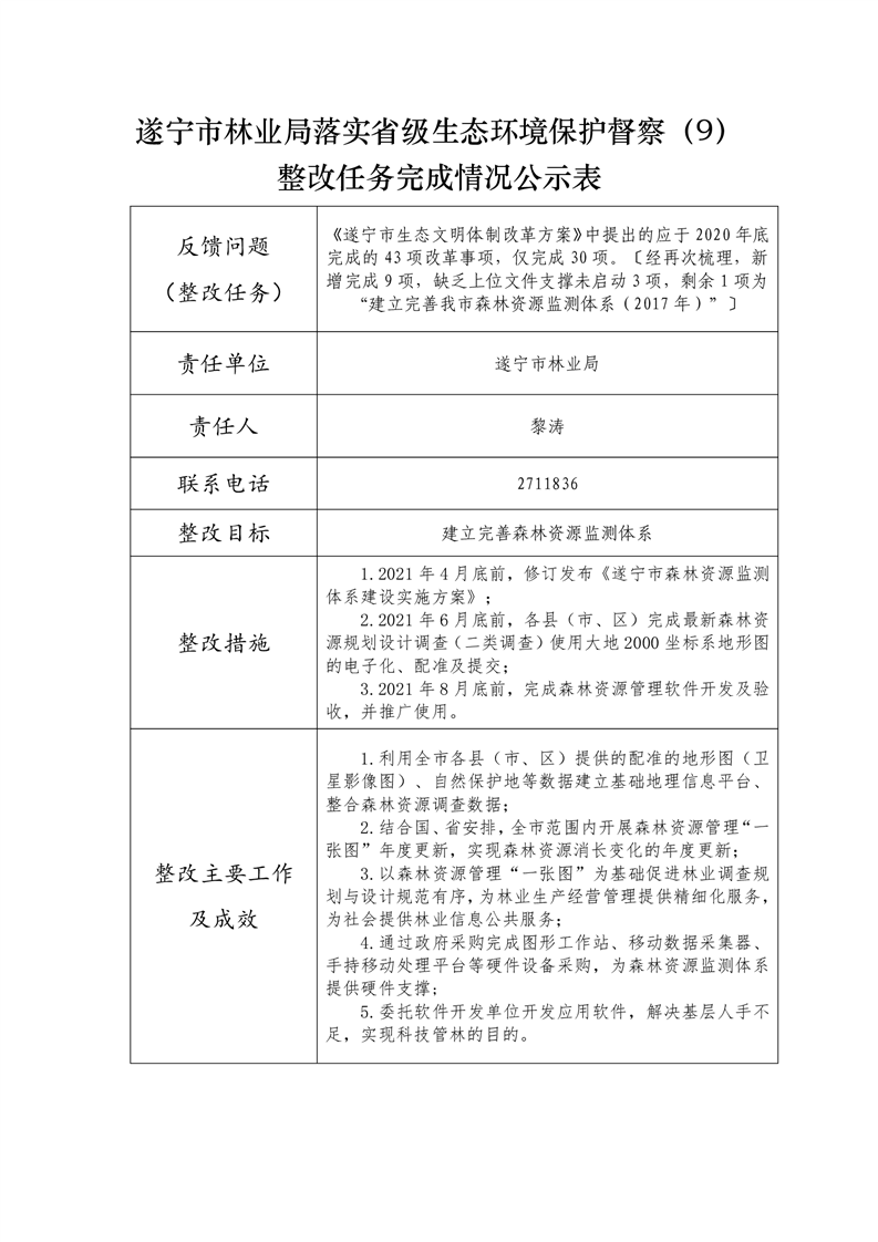 遂宁市林业局落实省级生态环境保护督察整改任务完成情况公示表